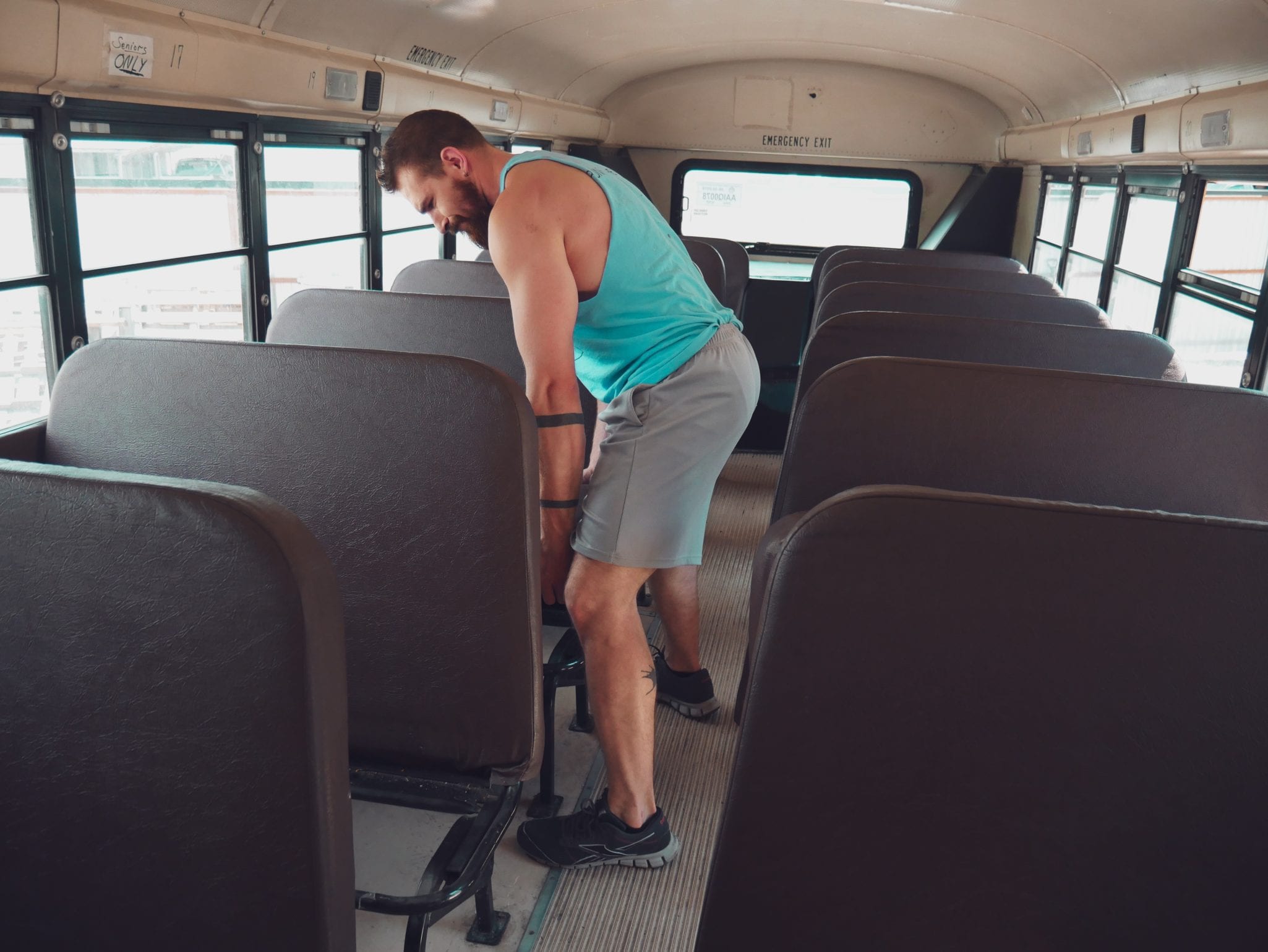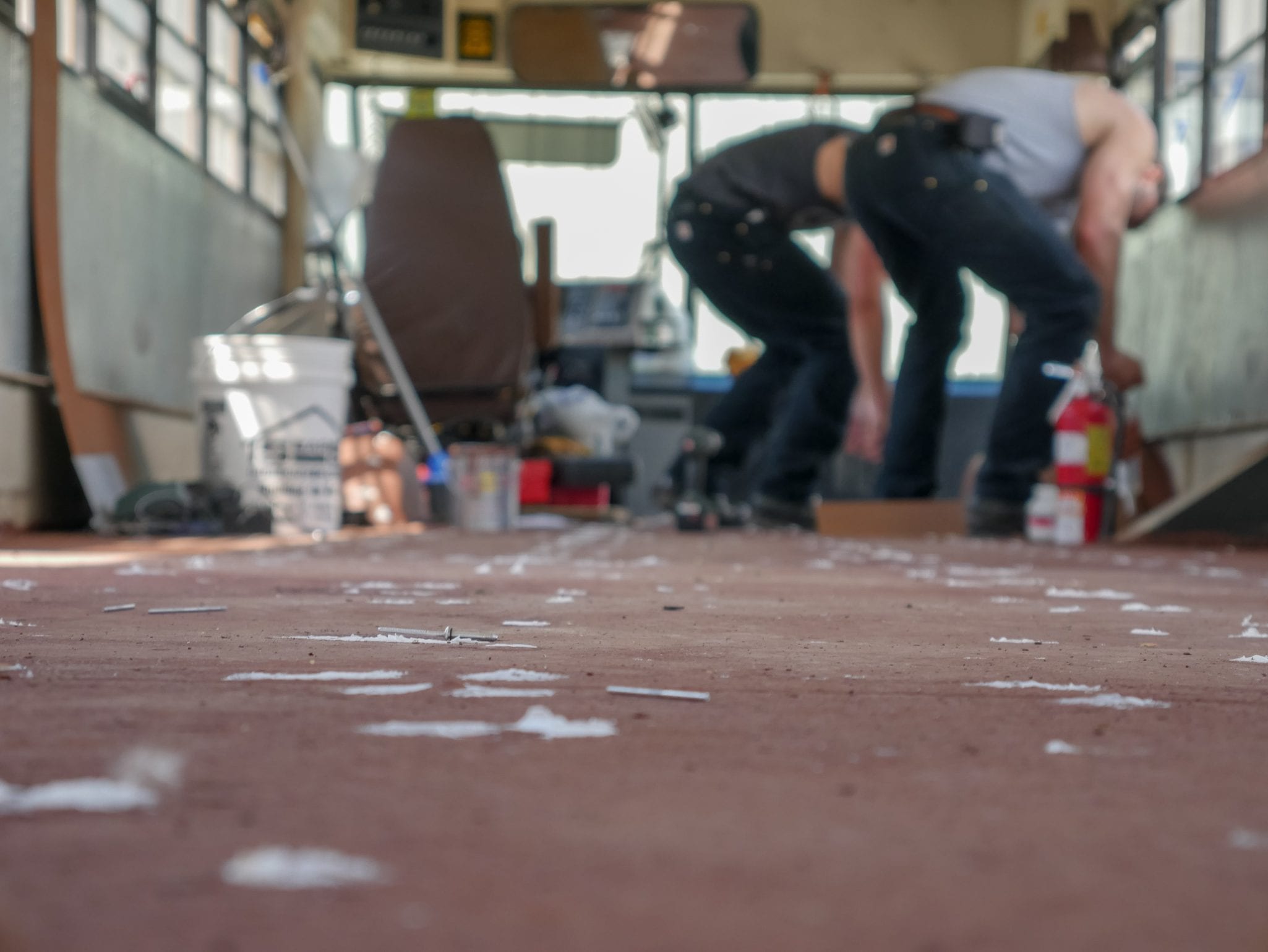As it turned out, the seats were bolted not only to the floor but through the floor. The connecting nut to each bolt was under the bus. That meant that one person was on the bolt on the inside, and another person had to find the adjoining nut underneath.