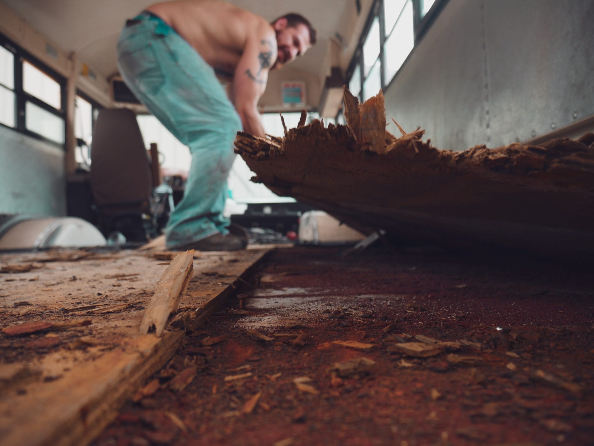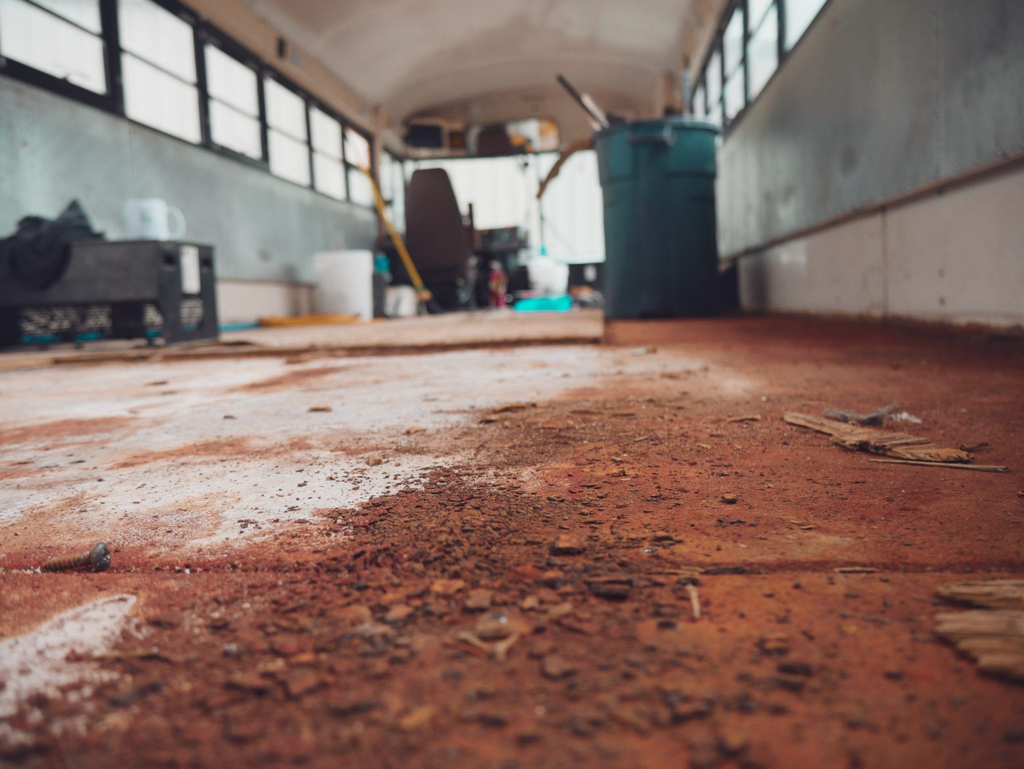 The subfloor is by far the worst job of deconstructing a school bus.