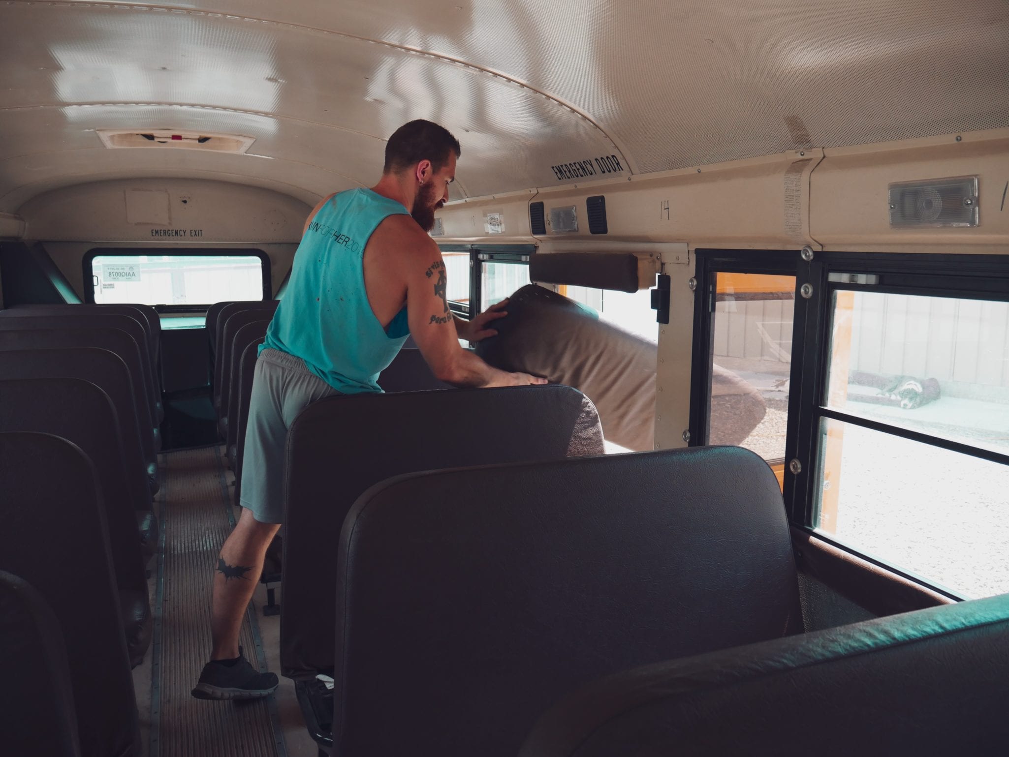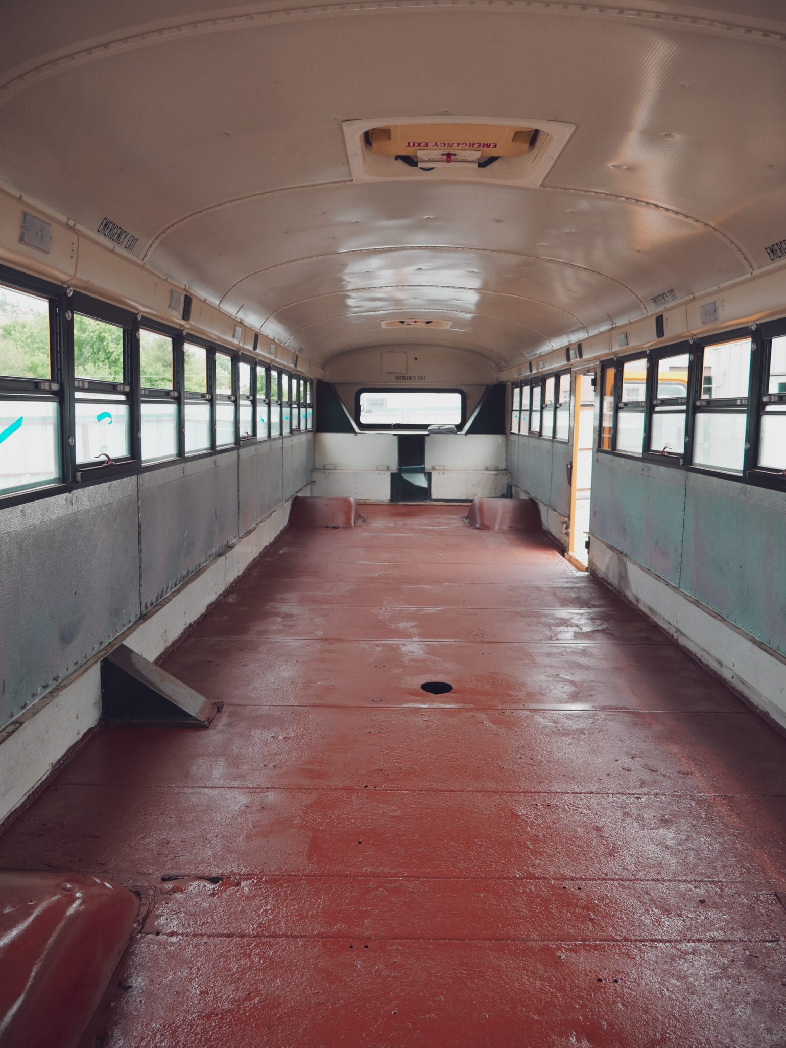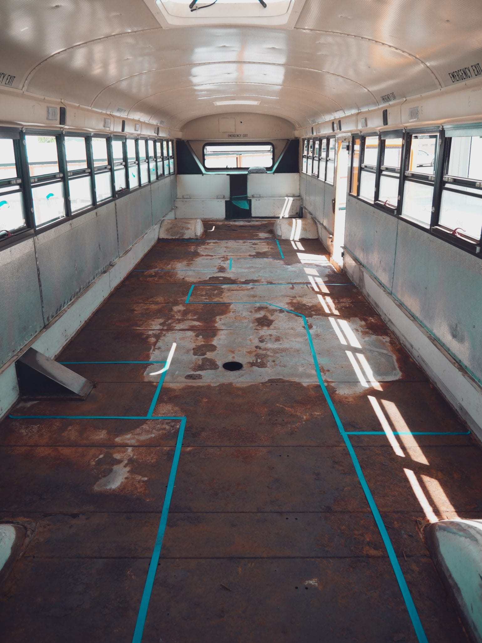 The first and most immediately satisfying step in deconstructing a school bus was removing all the seats. It went from a cramped school bus to a big, open space real fast. Having all the seats removed really showed us just how much space we had to work with.