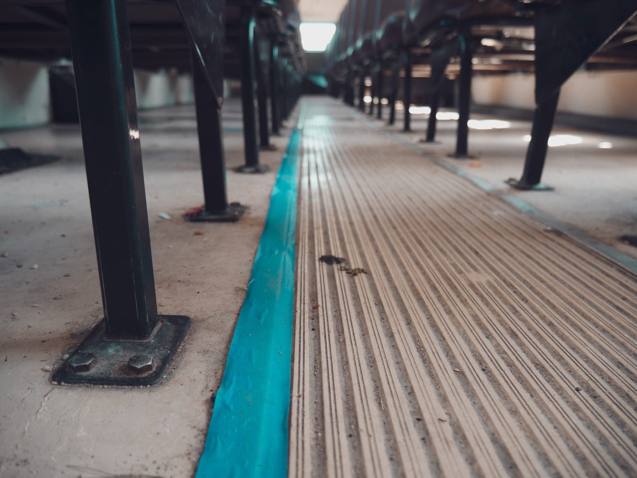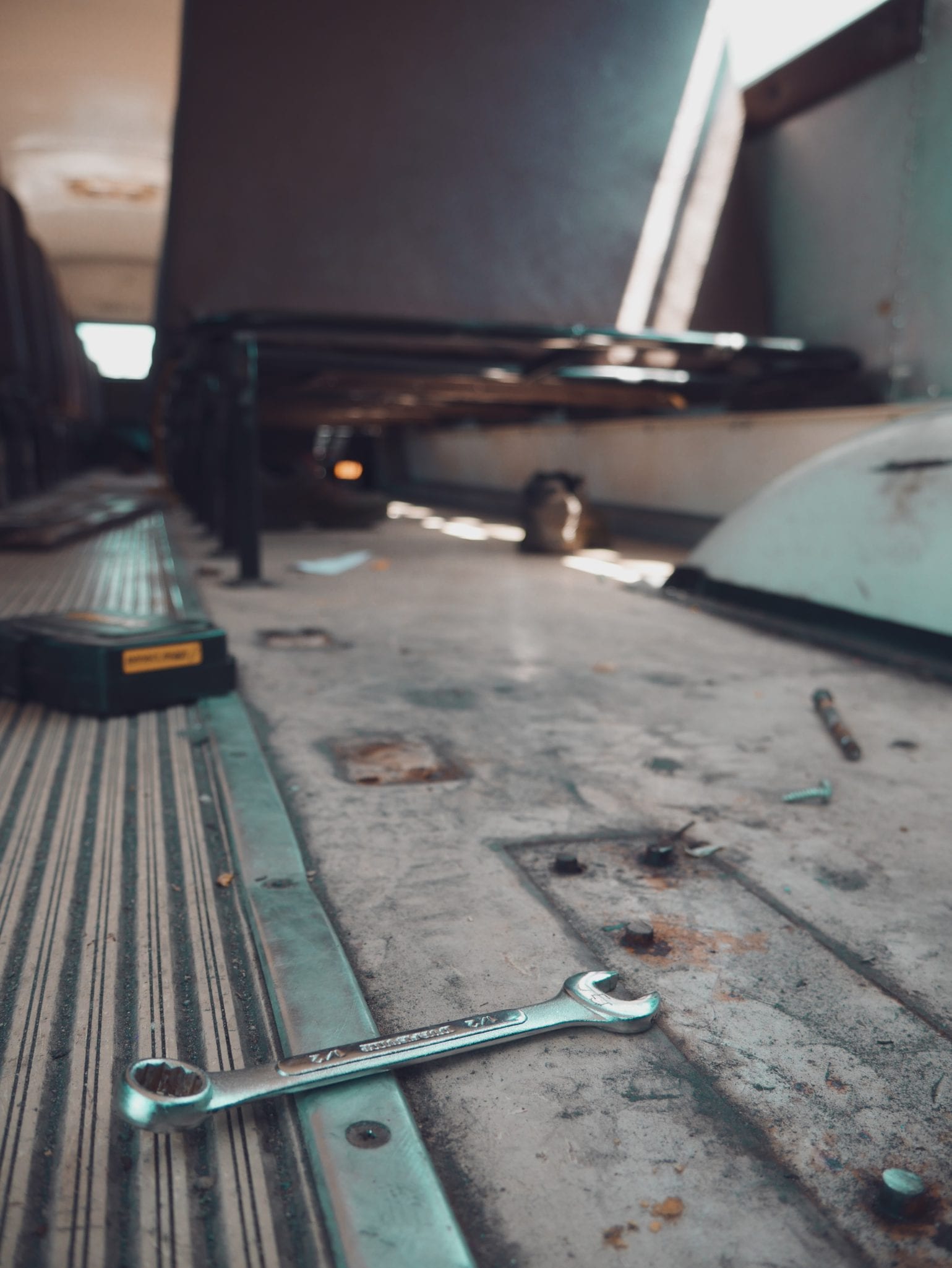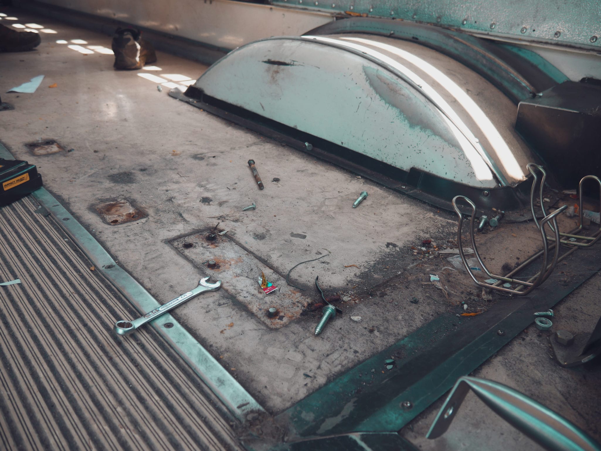 The floor was comprised of several layers. The top layer was metal trim, lining the aisle and the wheel wells. Thanks to 14 years of muddy shoes, snowy boots, and spilled beverages, these too were cemented in with rusty screws.