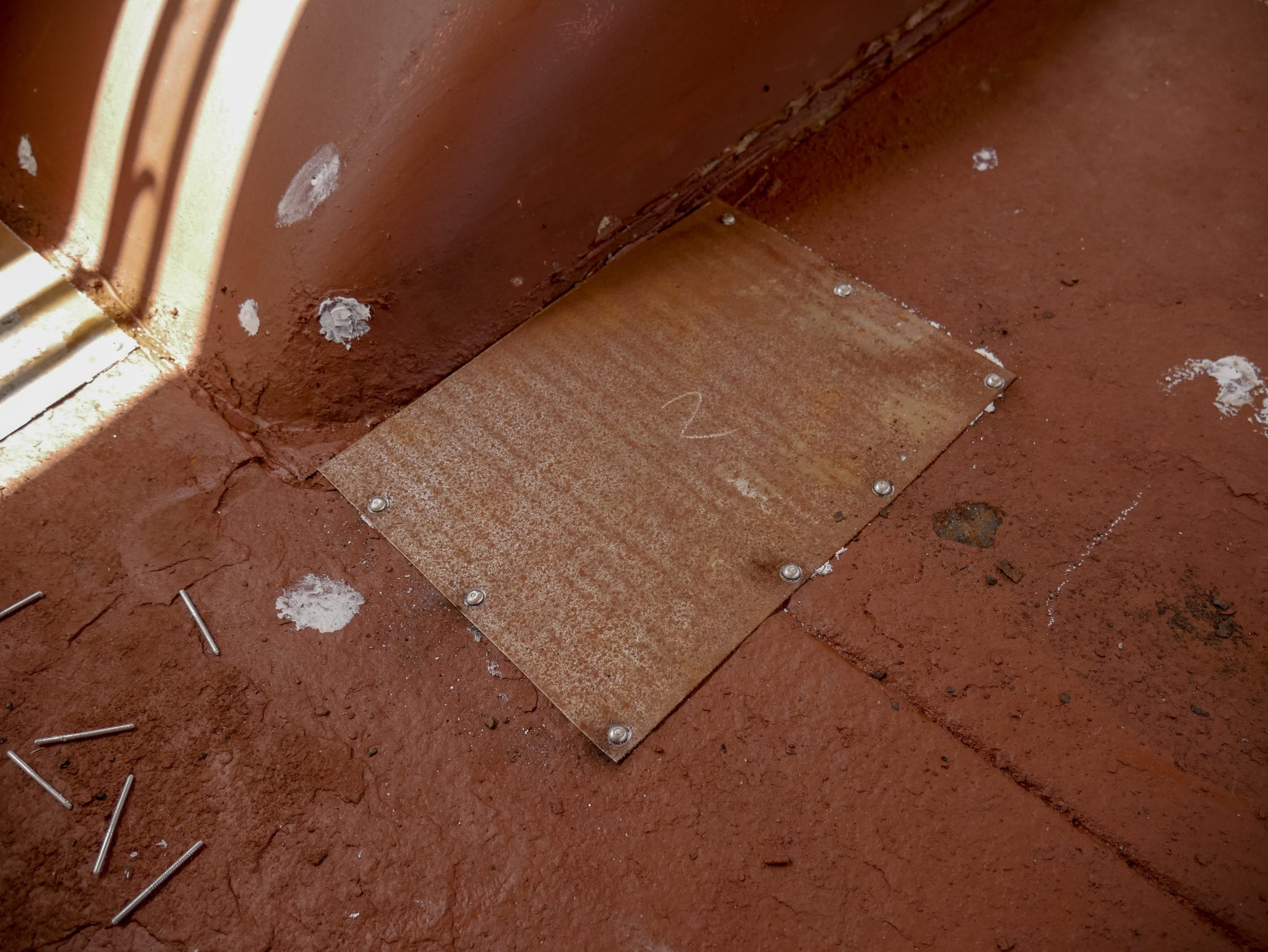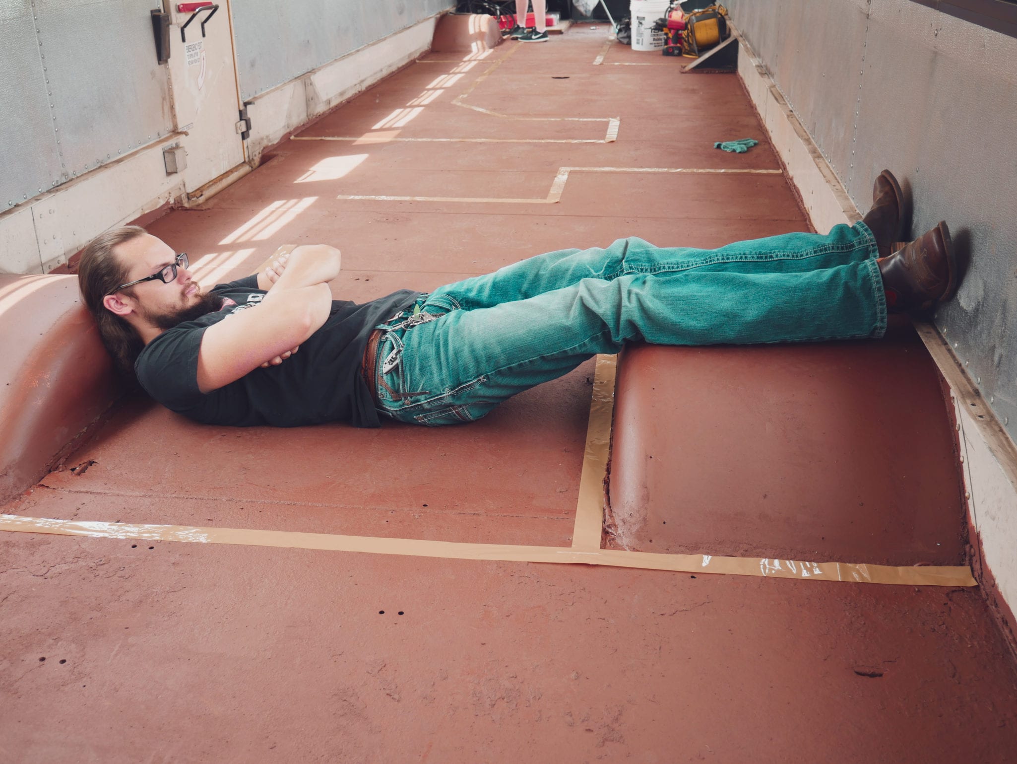 Luckily, Tawny’s dad is a metal worker and fixed us up with new metal patches riveted over the damage. After the repairs were made, we laid down a few coats of Rust-Oleum to protect the floor from further damage, and finally, almost a week later, the floor was done.