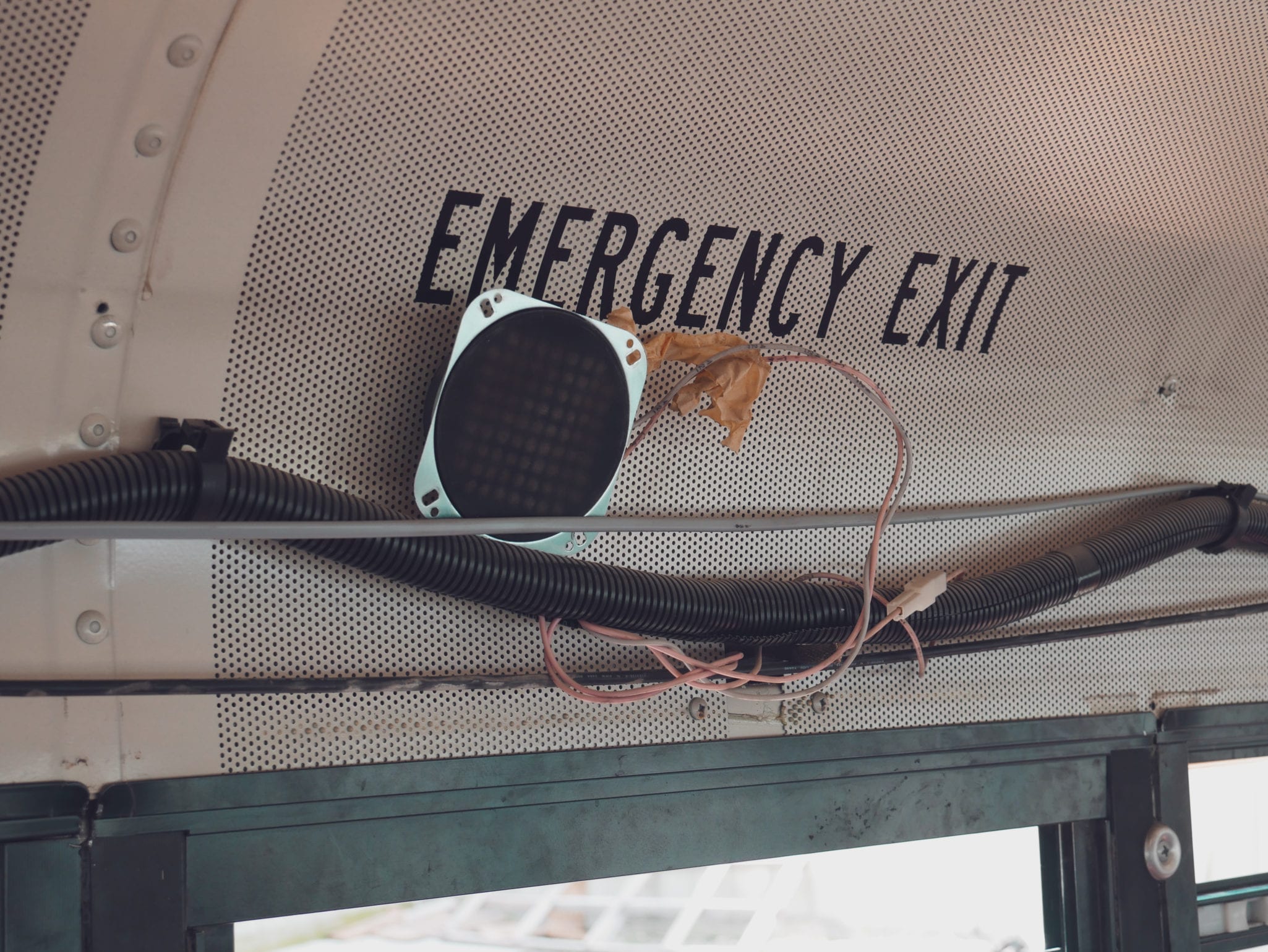 On the latter list were the speaker and light wires, along with the buzzer system that prevented the bus from being started if certain windows were open – a problem since our back window didn’t fully latch.
