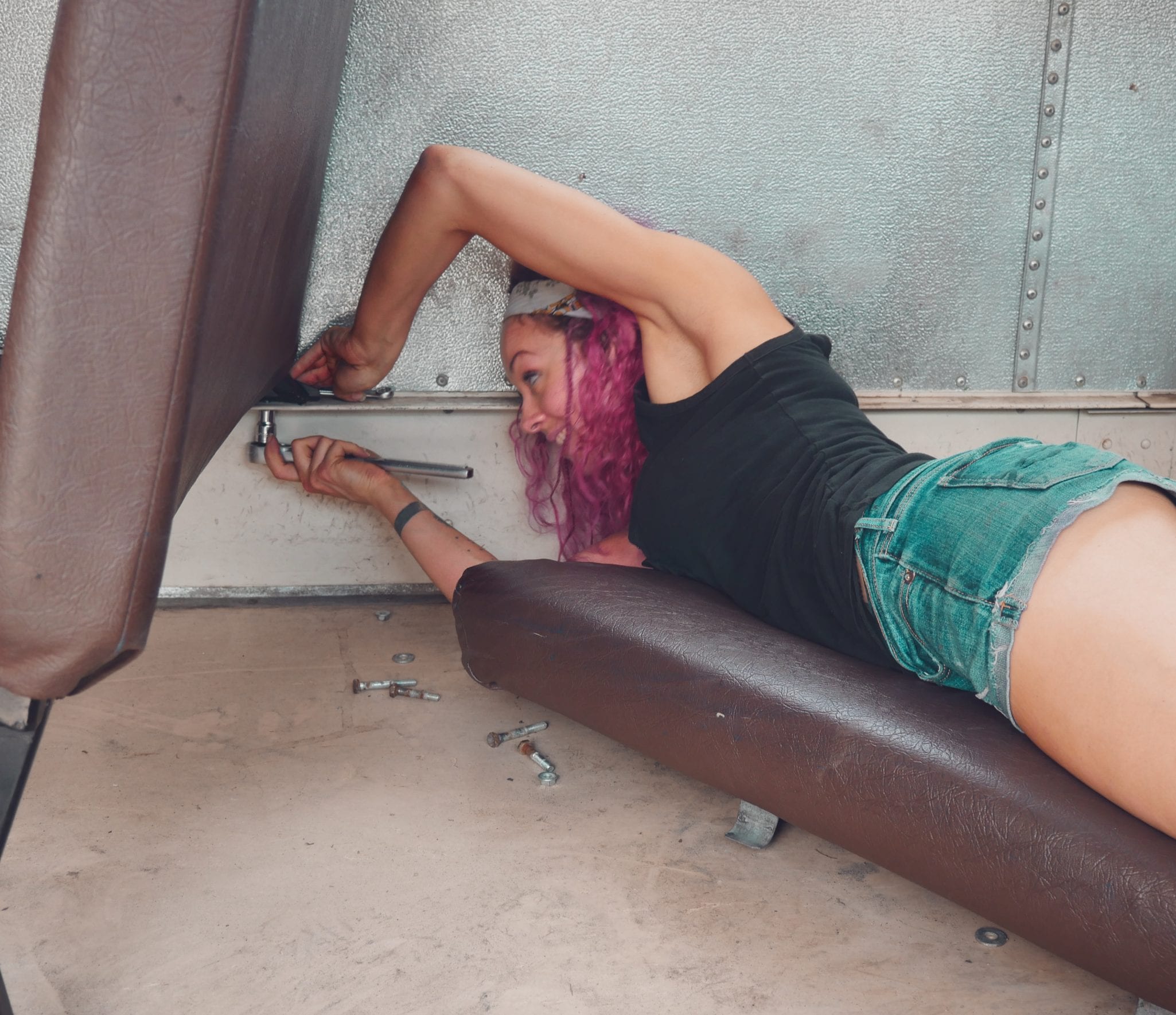 We tried using brute force, repeatedly spartan-kicking the seats that had a bolt or two removed trying to snap the rusty bolts off. It didn’t work well, although it did relieve some of the frustration that had started by day two when we were still only halfway done with this process.
